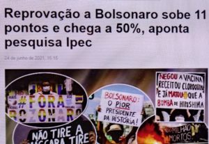 – Pois nos tornamos este pária! Luminares da estupidez, como Wintraub, Moro, Pazuello, Araújo, Salles foram defenestrados pelo Estúpido Maior e, mesmo assim, ainda existem 23% de brasileitos, segundo pesquisa IPEC, que aprovam seu governo…
