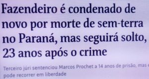 bleorgh.com – Há 23 anos, um fazendeiro paranaense, ex presidente da UDR, foi condenado por prender e matar um sem terra. Recorreu, o júri foi anulado e, em novo júri, foi condenado de novo, júri também anulado. Agora, foi condenado pela 3ª vez, há 14 anos e 03 meses de prisão.