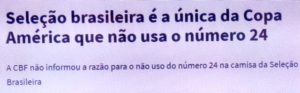 bleorgh.com – Os latinos, Brasil incluso, eram e são machistas e preconceituosos. Aqui, aliás, o nº 24 sempre foi estigmatizado porque designa o veado no jogo do bicho. Mas que a seleção pentacampeã do mundo é a única a não usar a camisa 24 nesta Copa América é algo ridículo…