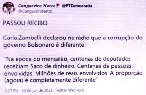 – Acho que o Mito vai ficar de mal dela… Imagino que, sem querer, ela reconheceu que há corrupção agora… mesmo sendo pra poucos, só bolsonários e milicos.