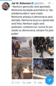 – Dia seguinte, o Mito posta imagens do vandalismo e afirma: “… nunca foi por saúde ou democracia, sempre foi pelo poder!” Quem botou os vândalos nas ruas? Quem mandou botar os vândalos nas ruas? A propósito, quem matou Marielle? Quem mandou matar Marielle?