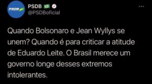 – Incompreensível para mim, pois, a declaração do tucano Eduardo Leite, que resolveu sair do armário na televisão e justificou o fato de apoiar o Mito nas eleições porque o PT era uma alternativa “muito ruim”. Aí, ele preferiu um defensor da tortura. Me engana que eu gosto!