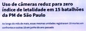 bleorgh.com – Parafraseando um velho ditado, o melhor detergente é a luz de uma câmera… Policiais de 15 batalhões da PM de São Paulo passaram a usar câmeras corporais, que gravam suas ações, sem possibilidade de interrupções. Em junho/2020, tais batalhões não mataram nenhum “bandido”!