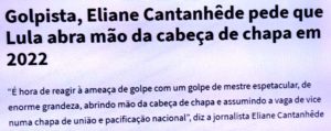 – Pode não parecer, mas é a mesma Cantanhêde que, lá atrás, apoiou o golpe contra Dilma e a prisão política de Lula. Com muitas fontes entre barões e milicos, ela está tentando desenterrar a direita light? Com Lula elegendo um tucano liberal que,eleito, continuaria vendendo o Brasil?