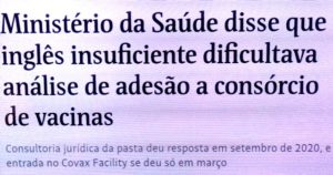 bleorgh.com – Confesso minha estupefação com a desculpa da Consultoria Jurídica do ministério (sic) da Saúde pra participação do Brasil no Consórcio Covax-Facility: documentação estava em inglês e os servidores não tinham conhecimento suficiente da tal língua pra emitir manifestação conclusiva.