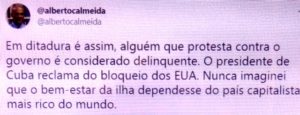 – Já fingir ignorância quanta a influência perversa do bloqueio americano, que já dura 63 anos, sobre o bem estar de Cuba, é menosprezar a inteligência dos mais velhos e acreditar na falta de conhecimento histórico dos jovens que frequentam as redes. Ou parcialidade explícita!