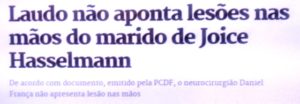 bleorgh.com – As investigações avançam no caso do “atentado” contra a deputada Joice Hasselman. É óbio que ela foi gravemente ferida, mas não há indícios de agressores nas câmeras de vigilância, nem a perícia indicou indícios de violência no corpo do marido.