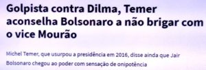 bleorgh.com – O conselho é de Michel Temer, quem diria?, o vice que tramou o golpe contra Dilma. Disse ele para o Mito: “Não convém brigar com o vice. Não é útil para a presidência e é inútil para o país. Isso dá uma instabilidade política e social, que pode até afetar a economia”
