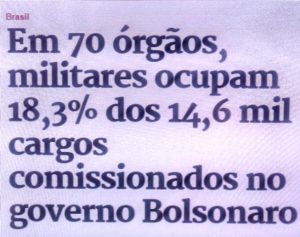 – Segundo relatório de julho do TCU, militares ocupavam mais de 18% dos cargos comissionados do governo (2,7 dos 14,6 mil cargos), sendo 598 da reserva e 2.075 da ativa. E o n° total de militares no governo, na Saúde, por causa da pandemia, e no INSS, por causa das filas, era de quase 06 mil…
