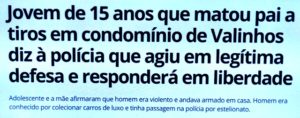 -…3. Jovem de 14 anos que pega arma no arsenal do pai e o mata pra parar com as agressões contra a mãe e ele próprio… Todos, a patroa, o vereador, o jovem, são pessoas de bem, que moram em prédios ou condomínios de luxo terrivelmente protegidos dos brasileiros comuns…