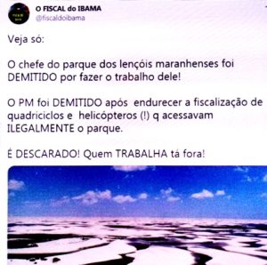 – Agora, leio a notícia de que o chefe do Parque foi exonerado pelo ICMBio porque estava endurecendo a fiscalização do tráfego de quadriciclos, veículos do tipo UTV e até helicópteros que acessavam ilegalmente o parque. Alguma novidade?