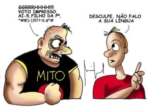 – Se o fizer, as tevês vão divulgar? E o Ministro da Justiça vai me equadrar na Lei de Segurança Nacional por causa disto? Posso ser preso por difamação? Algum advogado me esclareça, por favor, por que eu estou afim de chamar o Mito de filho da p..*, sem asterisco!