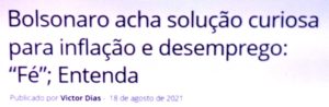 – Tudo bem: fé, vontade e crença ajudam… mas trabalhar e apresentar programas que reanimem a economia, reduzindo o nº de desempregados e o nº de esfomeados ajudaria mais. Deus criou homens e mulheres e deu-lhes o livre arbítrio pra que se virassem aqui na Terra… A maioria enrola…