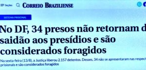 blorgh.com – Já começou a grita das camadas mais bem assistidas da população contra o saidão de presos da Papuda. Motivo: 34 presos não retornaram ao presídio. O asidão beneficiou 2.157 detentos, ou seja, 2.123 (98,5%) cumpriram as regras e voltaram.