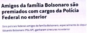 – Colunista Malu Gaspar informa que um papiloscopista e um escrivão da PF foram nomeados como adidos policiais em Lisboa e Miami, apesar de não serem delegados federais. Mas, têm peso no governo: são amigos pessoais do Dudu 03, também escrivão da PF antes da deputança.