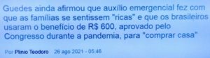 bleorgh.com – A esquerda chama isto de insensibilidade social… eu chamo de elitismo, falta de noção, desrespeito humano e mau caratismo. Em entrevista, Guedes diz que o auxílio emergencial fez as pessoas se sentirem ricas e usarem o auxílio para comprar casa…!