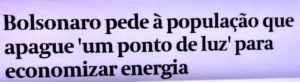 bleorgh.com – O Mito tem poucas ações como governante, mas foi bem incisivo quando exigiu o fim do horário de verão. Não demorou e já estamos enfrentando a pior crise hídrica dos últimos cem anos. Então, ele faz uma live e pede pra cada um desligar uma luz todo dia.