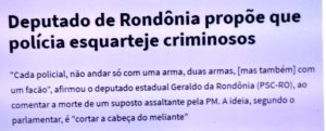 – Depois chegaram os produtores rurais e os pecuaristas, não tão pacíficos, destruindo florestas, expulsando índios e plantando uma nova sociedade, não muito pacífica. Tem até um deputado que exige que a polícia ande com armas e um facão, pra ‘cortar a cabeça’ dos bandidos!