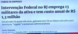 – A intervenção militar na Segurança do Rio foi desativada há 03 anos, mas seu Gabinete continua ativo, vinculado à Casa Civil e com 13 militares e 05 cargos comissionados, ao custo mensal de R$105,2 mil. Por acaso, ele monitora os traficantes pra avisar o Planalto? Intervenção 1