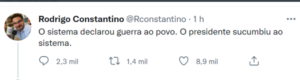 – Rodrigo Constantino fala em “jogada inteligente”, Alexandre Garcia diz que ele “mostrou amadurecimento” e Augusto Nunes culpou os inimigos: “Um presidente não pode brigar em várias frentes a todos os momentos, isso que queriam seus inimigos”. E se acham jornalistas!!!