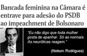 bleorgh.com – É… o que se há de fazer? Das 09 deputadas federais do PSDB, 07 são alinhadas com o Mito…Como dizia Nelson Rodrigues, nem toda mulher gosta de apanhar… Só as normais! Tucanas, por exemplo…