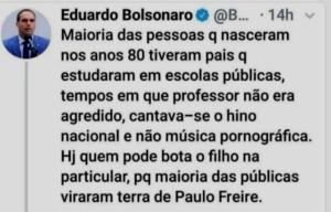 – A privatização total só começou a ser barrada nos primórdios do séc. XXI, quando governos progressistas foram eleitos e criaram piso salarial de professores e implantaram 282 escolas técnicas, 03 vezes mais do que foi construído em 01 século de história do Brasil.