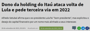 – Daí a GloboNews faz um debate com postulantes à 3ª via, Miriam Leirão tece rasgados elogios a outro postulante que não participou do debate e o presidente do Itaú diz que Lula foi “bom presidente”, mas que o baronato financeiro prefere alguém mais alinhado a seus interesses…