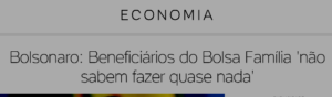 7 – Palavras do MitÔ: “Não tem como tirar o Bolsa Família do pessoal, como alguns querem. São 17 milhões de pessoas que não tem como ir mais para o mercado de trabalho. Com todo o respeito, não sabem fazer quase nada….” E a culpa é do PT, segundo ele…