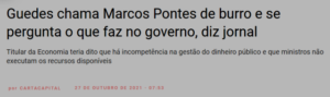 1 – De duas, uma: ou a conversa mole do MitÔ não convenceu Paulo Guedes que ele continua prestigiado ou ele começou a chutar o pau da barraca que sustenta o Posto Ipiranga! Além de chamar o ministro astronauta de burro, ele criticou os ministros (sic) Onix e Marinho.