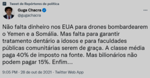 9 – Ninguém pode acusar o global Guga Chacra de comunista ou, sequer, de esquerda. E ele conhece bem o país em que vive há muitos anos já. Que é pai e mãe do capitalismo cristão ocidental. Durante séculos, nós fomos dominados por esta cultura E nunca aprendemos!