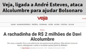3 – Estão dizendo que a Veja, ligada ao André Esteves, está desancando o Alcolumbre pra alegrar o MitÔ, por causa do veto dele ao André Mendonça. Não acho não! Qualquer assunto relacionado à rachadinhas, deixa o MitÔ agoniaso, querendo dar tiro em quem fala no tema.
