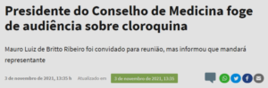 9 – A Comissão de Controle e Fiscalização convidou o presidente do Conselho Federal de Medicina para discutir, na Câmara, recomendações dadas pelo CFM ao governo sobre o protocolo da cloroquina. Ele deu uma desculpa e não foi. É bolsonarista, com absoluta certeza!
