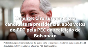 - Ciro volta ser Ciro? Injuriado com a votação de parte da bancada do PDT a favor da PEC dos Precatórios, Ciro suspendeu sua pré-candidatura à Presidência. Só retoma se os deputados voltarem atrás na 2ª votação. E foi na jugular ao definir o que é esta PEC: