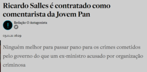 10 – Cá pra nós, eu acho que o lugar mais adequando para o Ricardo Salles é a prisão. Por tantos anos quantas foram as árvores queimadas por ele enquanto ministro (sic) do MitÔ… Mas confesso que sua decadência também me alegra: de ministro a comentarista da JovemPan…