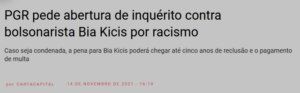 – A deputada Bia Kicis é useira e vezeira desta estratégia. Para atacar Moro e Mandeta, pintou-os de negro numa live em que dizia que estavam procurando emprego no Magazine Luíza (que estava fazendo trainee apenas para negros). A PGR, então, acusa-a de racista…