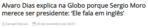 4 – O senador Álvaro Dias, Todo Poderoso do Podemos, diz que o diferencial do presidenciável Moro é que ele fala inglês. Estão vendo? O complexo de vira-latas não é uma particularidade do povo só não… Autoridades e gente de bem também tem…