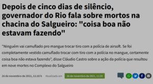 – Disse Cláudio Castro: “…Se foi completamente vestido camuflado trocar tiro com a polícia no mangue, certamente coisa boa não estava fazendo” É possível… mas porque, então, a polícia deixou os corpos lá no mangue? Um aviso pra comunidade? Pra eliminar provas?