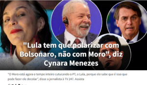 1 – Eu gosto muito da posição combativa da Cynara Menezes… mas discordo da avaliação dela que Lula tem que polarizar com o mitÔ. Quem tem que se confrontar com ele é o Moro, Leite ou Dória e Mandetta e demais figuras inexpressivas que tentam ser expressivas.