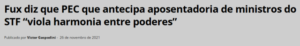 – Naquela ocasião, parte dos políticos não queriam dar a chance da presidenta Dilma indicar até 05 ministros supremos e mobilizaram o apoio da Justiça pra mudar a aposentadoria compulsória de todos os seus membros de 70 para 75 anos. Fux havia sido indicado por ela, aliás.