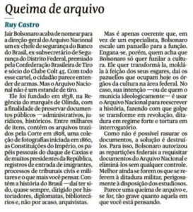 – Destruídas as estruturas existentes, chegou a vez da memória: foi nomeado como diretor geral do Arquivo Nacional o Ricardo Borda D’água, sem qualquer conhecimento da área, mas especialista em segurança e dono de clube de tiro… Documentos e livros são bons alvos, de certo.
