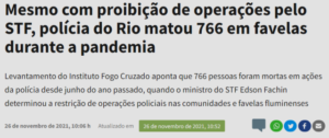 -…e, enquanto isto, a polícia do Rio mata 766 favelados em operações realizadas morros acima (ou ao meio, pois eles não costumam subir muito…). No início da decisão, junho/ 2020 , houve uma queda vertiginosa na matança, mas a partir de outubro, voltou ao normla!