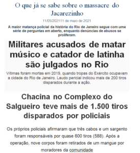 – Em Jacarezinho foram 28 mortos, sendo só 01 policial, “em confronto direto”… em Guadalupe foram mais de 200 tiros pra matar 01 músico e 01 catador de latinhas e, no Salgueiro, a morte de 01 policial resultou em 09 cadáveres escondidos no mangue…