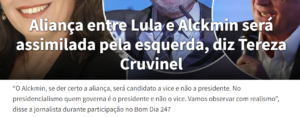 9 – Muita discussão nas redes sobre uma possível chapa Lula-Alkmim. A 3ª via, via grande imprensa, tenta criar óbices, a esquerda suspeita e o petismo torce o nariz levemente. Os bolsonários, acho, já estão fora do jogo. Qual é a desconfiança? O direitismo de Alkmim?