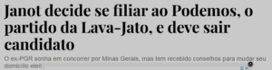 – Foram tão fundo no lamaçal da Lava Jato que não podem recuar e reconhecer que cometeram erros crassos. E ficam obrigados a prestigiar as candidaturas de Moro, Dallagnol e do falecido Janot, todos pelo Podemos. Podemos votar neles? Sim… afirmam os imbecis!