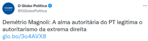 – Vive falando na “alma autoritária do PT”, o partido que governava o país exatamente quando ele ascendeu de sociólogo e geógrafo a comentarista da grande imprensa. Nunca foi constrangido pelo governo petista… Que alma autoritária é esta que tolera o ódio adversário?