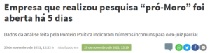 – Uma empresa, Ponteio, com 05 dias de existência, realizou pesquisa eleitoral que deu o ex juiz com 11% de preferência popular, um espanto! O que não espanta é que a grande imprensa comprou a pesquisa e quase já dá Moro no 2º turno…