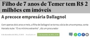7 – O mundo já tinha ficado boquiaberto ao saber que Michelzinho, o filhote de 07 anos do Temer presidente da República, tinha um patrimônio de R$2 milhões em imóveis… Estranho, mas plausível: o pai já transferira para a raspa do tacho parte do seu próprio patrimônio…