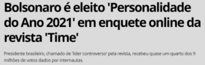 – Resultado: o MitÔ foi eleito, em votação popular, pela Time, como Personalidade do Ano de 2021, batendo até seu IDALO, Trump. Pra evitar queda de vendas, a Time fez questão de esclarecer que o leitor escolheu o “controverso líder” como personalidade “para o bem ou para o mal”.
