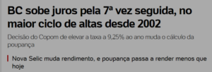 – Daí, aplicações como Tesouro Selic e fundos DI, feitas por quem tem algum dinheiro sobrando, terão um rendimento nominal maior a cada mês. Já a poupança, único salva guarda de quem não enfia dinheiro debaixo do colchão, terá um rendimento menor a cada aumento dos juros.