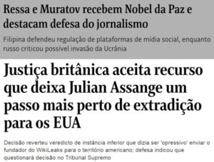 13 – As contradições do mundo ocidental, dito democrático: enquanto a filipina Maria Ressa e o russo Dimitri Muratov recebiam o Prêmio Nobel da Paz em Oslo, pela defesa desta democracia em seus países, a justiça britânica aprovava a extradição de Julian Assange pros Estados Unidos.